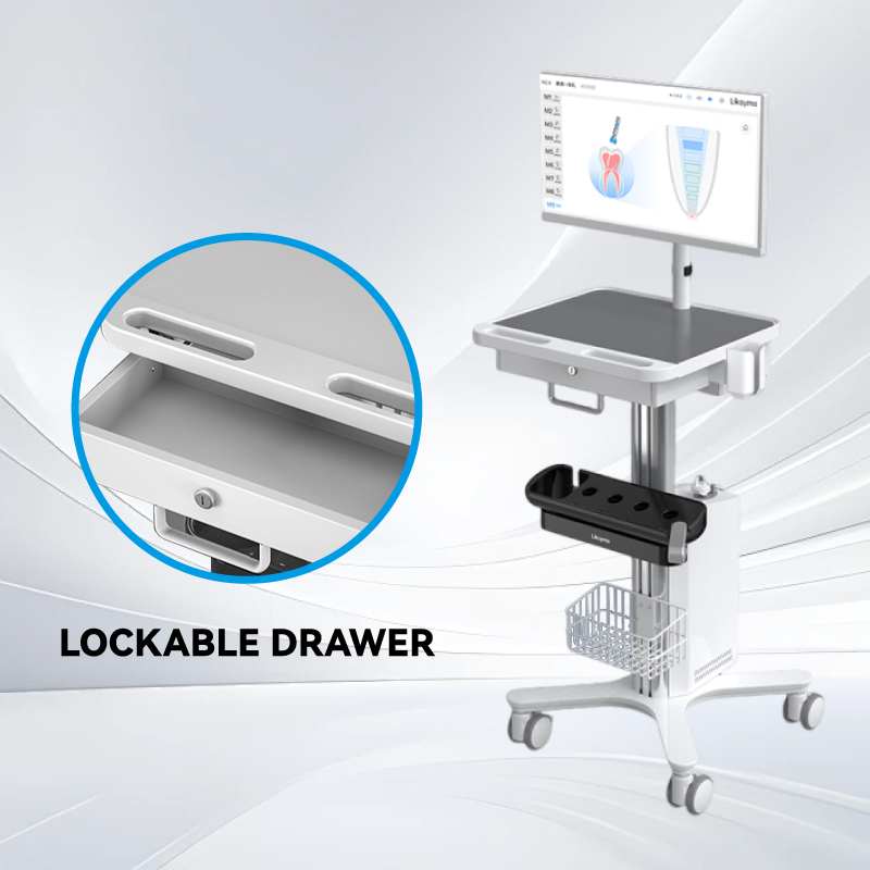 Рабочая станция оснащена запирающимся ящиком, органично интегрированным в элегантный белый корпус. Выдвижной ящик с круглой вставкой оснащен центральным замком и удлиненными ручками для удобного доступа. Этот защищенный отсек обеспечивает надежное хранение ценных инструментов или материалов, обеспечивая как порядок, так и защиту от несанкционированного доступа в клинической среде.