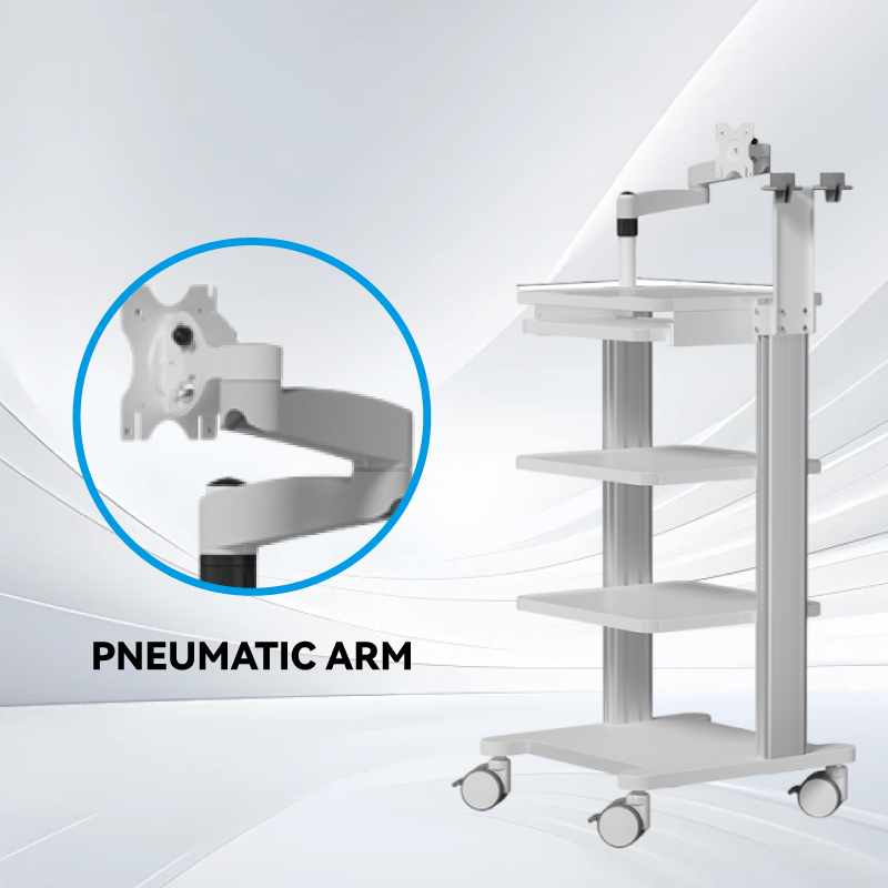 Газонаполненный рычаг обеспечивает лёгкую и регулируемую фиксацию мониторов и медицинских приборов. Пневматический цилиндр обеспечивает плавное перемещение по вертикали и горизонтали, надёжно фиксируясь на любой высоте и под любым углом. Это повышает эргономичность и эффективность рабочего процесса в клинических условиях, снижая нагрузку при длительном использовании.