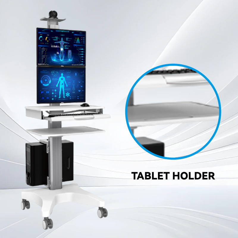 Интеллектуальная тележка для округления оснащена двумя дисплеями для эффективного просмотра данных, выдвижной клавиатурой для удобного ввода данных и универсальным лотком для медицинских инструментов, что оптимизирует клинические рабочие процессы на месте оказания медицинской помощи.