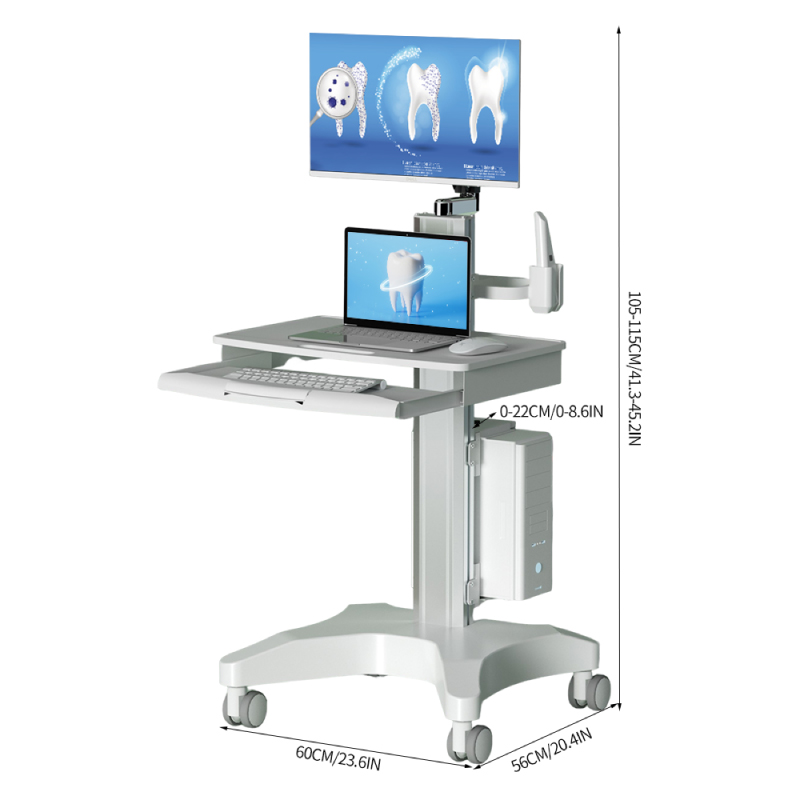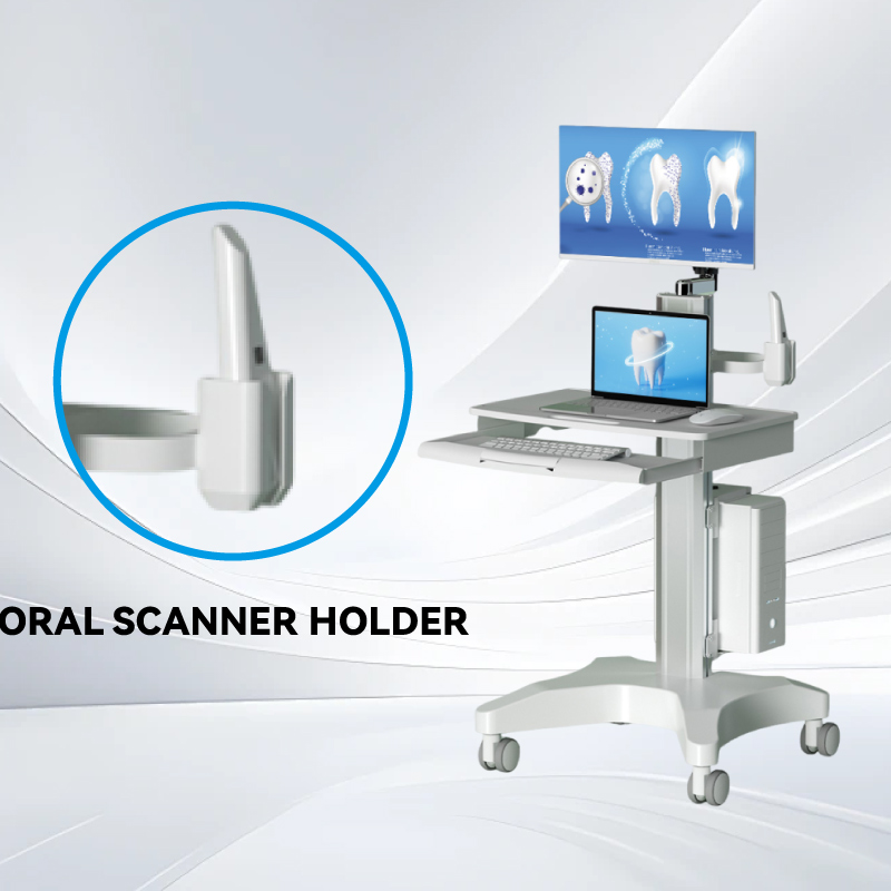 Элегантная, многофункциональная стоматологическая рабочая станция с регулируемым монитором, встроенным креплением для процессора, выдвижной полкой для клавиатуры и надежным держателем орального сканера. Создана для мобильности и эффективности работы в клинике.