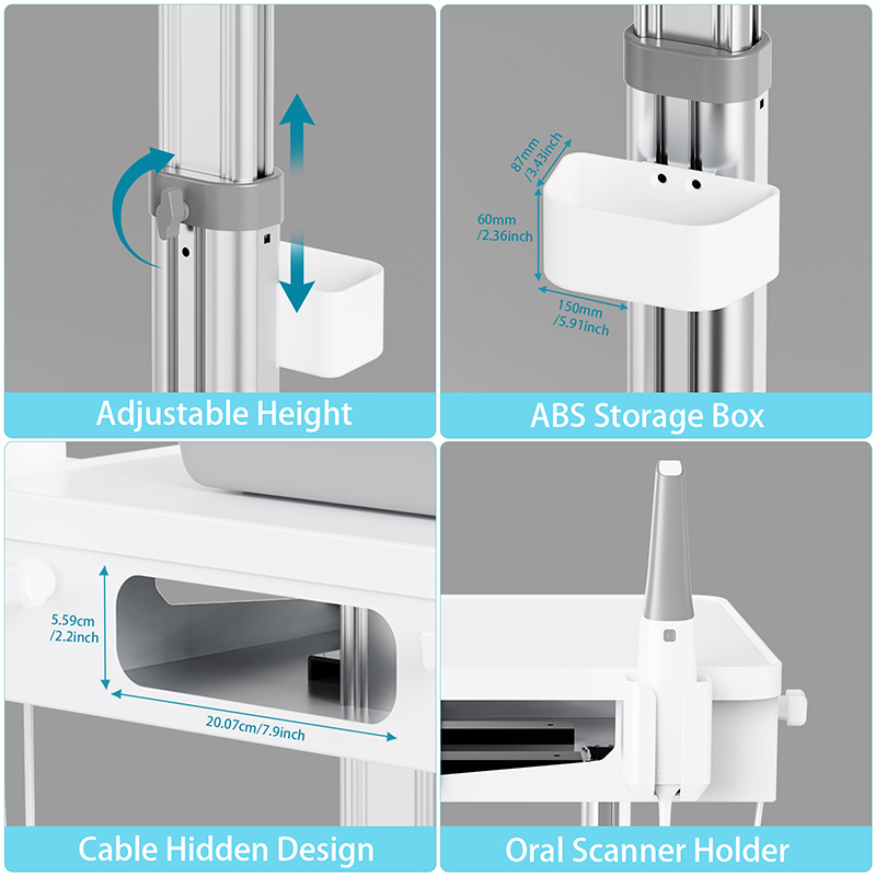 Эта тележка, специально разработанная для стоматологических клиник, служит незаменимым мобильным рабочим местом для внутриротового сканирования и диагностики. Стоматологи могут свободно перемещать тележку к местам пациентов, размещая внутриротовые сканеры и ноутбуки для быстрого сбора данных о полости рта, что делает ее незаменимой для процессов цифровой реставрации зубов и ортодонтического лечения.
