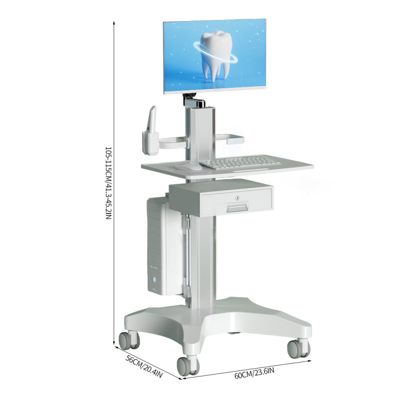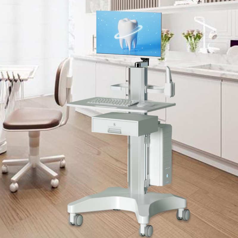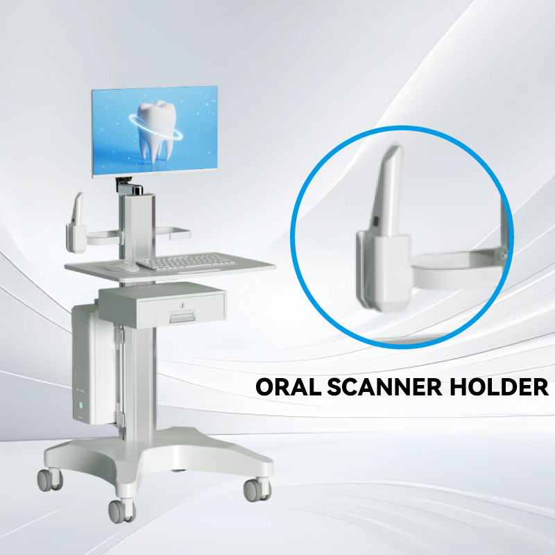Эта универсальная стоматологическая тележка включает в себя рабочую станцию с ПК, регулируемый монитор для 3D-сканирования и надежный держатель для орального сканера. Оснащена выдвижной полкой для клавиатуры и запирающимся ящиком для организованного хранения, что обеспечивает эффективную и мобильную работу в клинике.