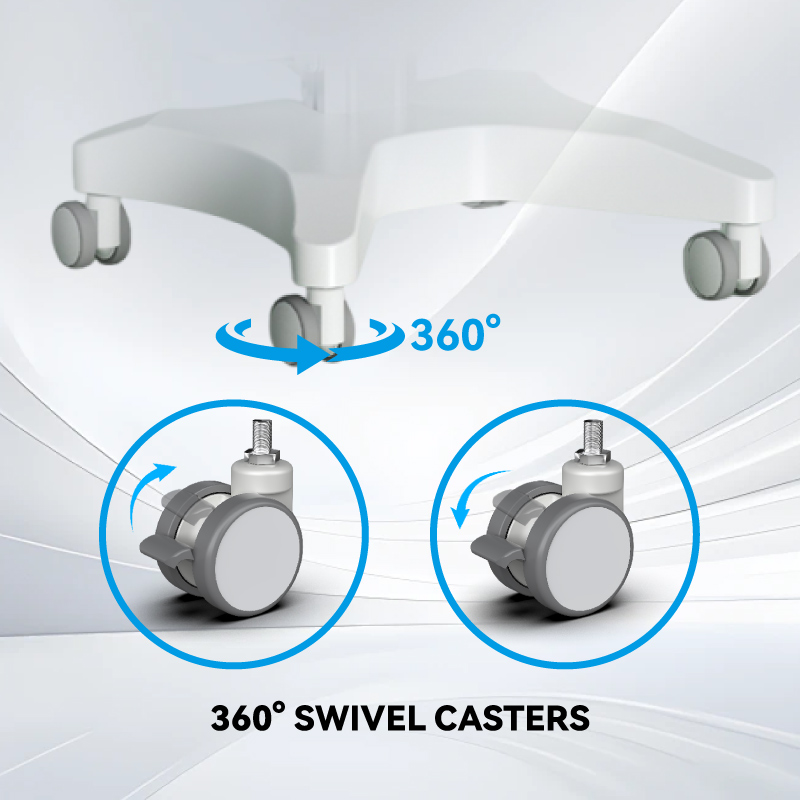 TЭти прочные ролики обеспечивают плавное и многонаправленное движение, позволяя легко перемещать оборудование. Простой механизм блокировки с фиксацией надежно фиксирует колеса, обеспечивая абсолютную устойчивость во время процедур. Идеально подходят для медицинских и стоматологических тележек, требующих как легкого перемещения, так и надежной фиксации.