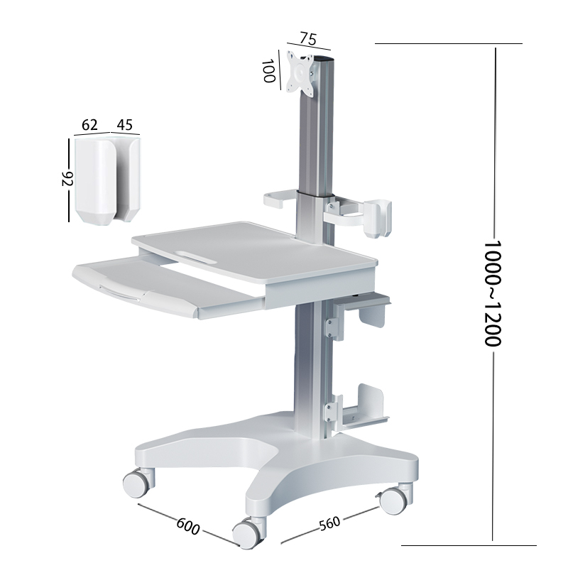 Это современная мобильная медицинская тележка, оснащенная большим регулируемым монитором, выдвижной полкой для клавиатуры и специальным держателем для ручного сканера.
