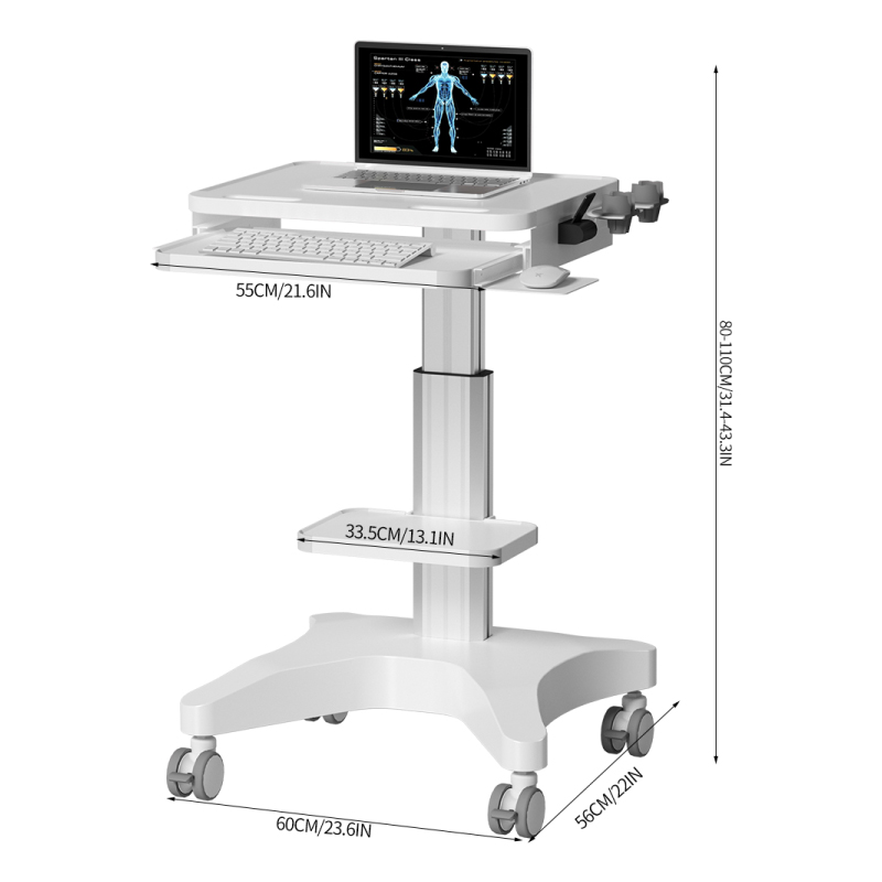 Эта элегантная медицинская тележка имеет регулируемую высоту и встроенный ноутбук с анатомическими данными. Встроенная подставка для клавиатуры и плавно вращающиеся ролики обеспечивают эффективную работу в условиях клиники.