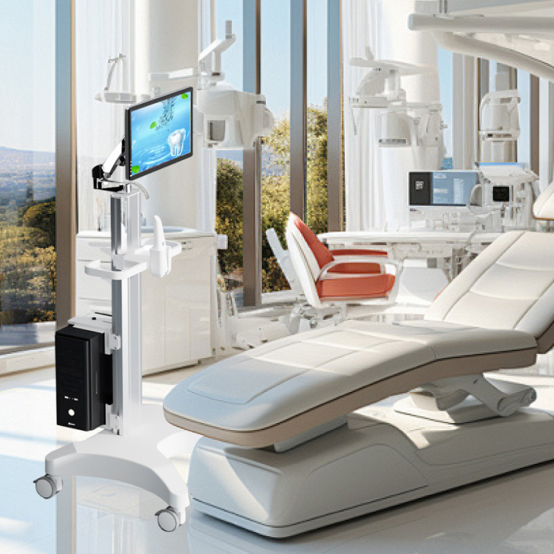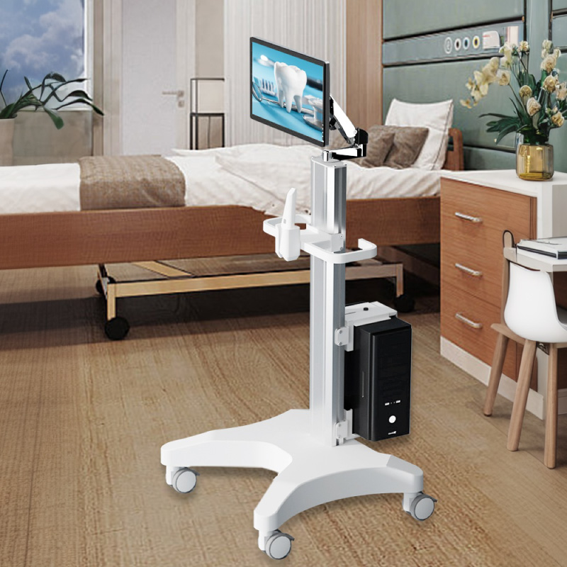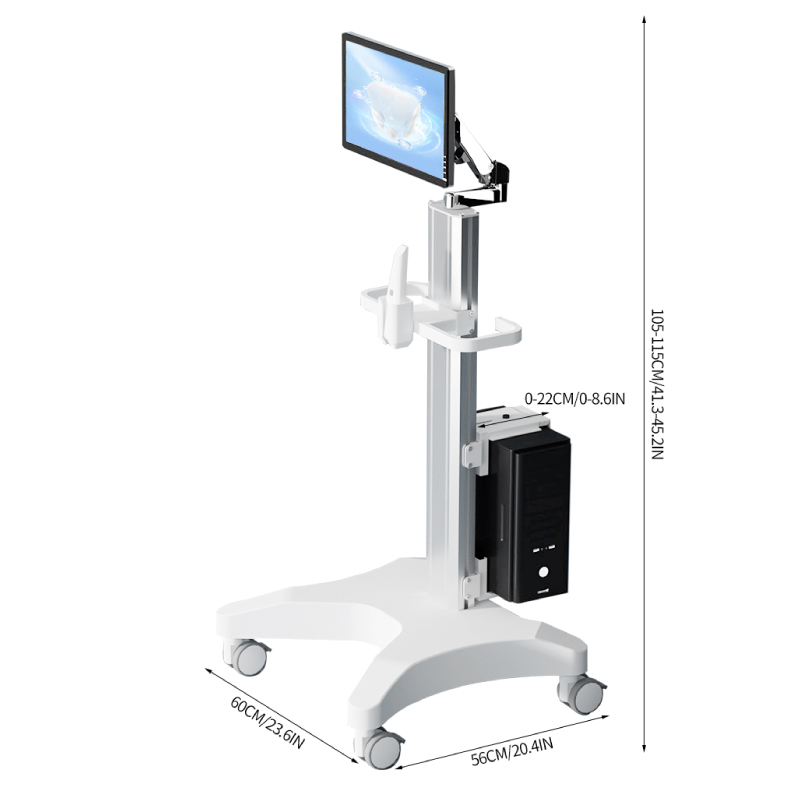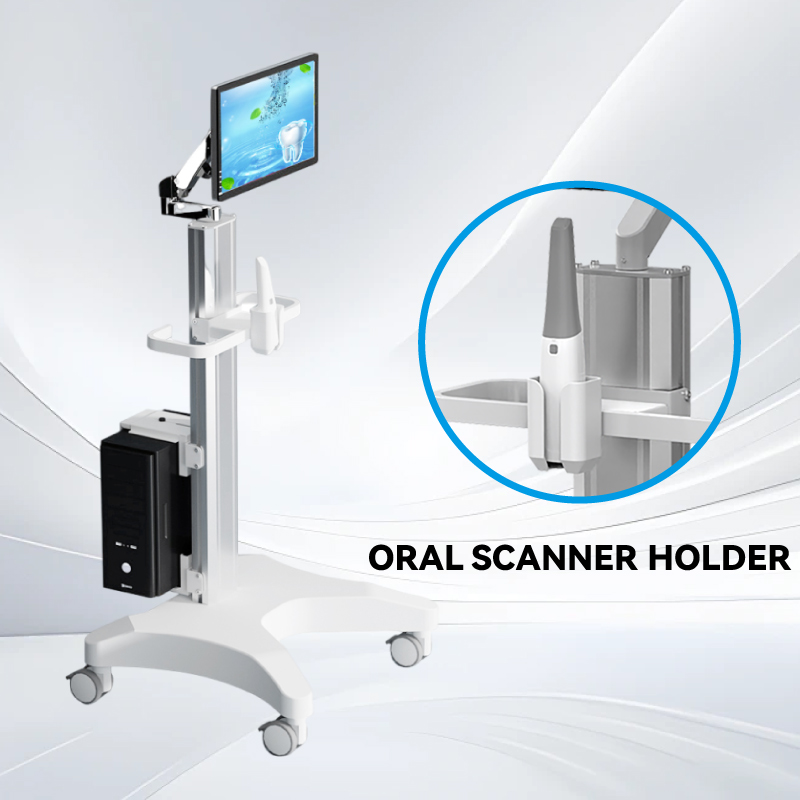 Медицинская тележка с регулируемой высотой и пневматическим рычагом, обеспечивающим свободное перемещение и вращение во всех направлениях, оснащена держателем внутриротового сканера.
