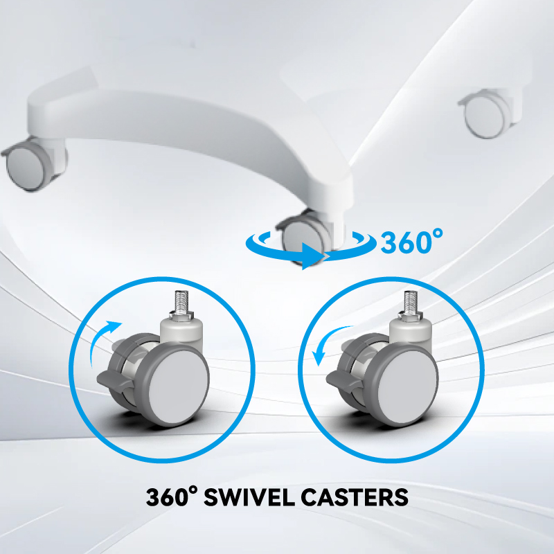 Тележка для ноутбука Likaymo оснащена четырьмя 3-дюймовыми (7,5 см) поворотными на 360° колесами с ножными тормозами для плавного перемещения и надежной фиксации. Большие колеса легко преодолевают пороги и неровности ковровых покрытий, обеспечивая легкую маневренность на различных типах полов в клиниках, больницах и салонах красоты. Благодаря прочной раме тележка остается устойчивой во время использования, а фиксаторы колес надежно фиксируют ее в неподвижном состоянии.
