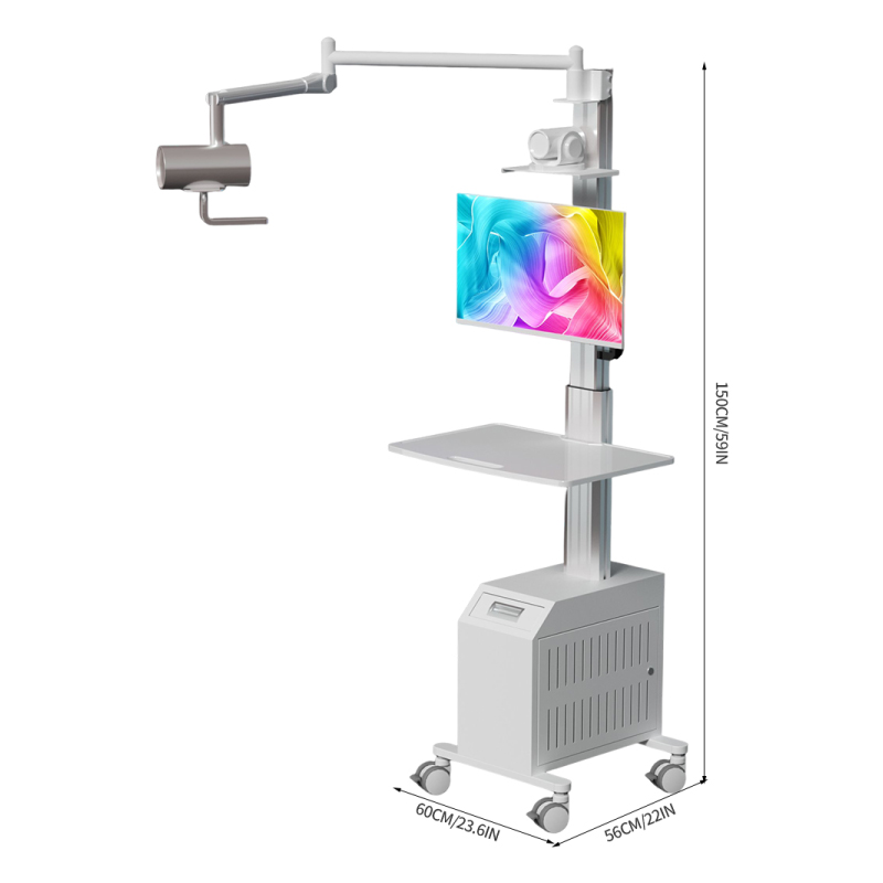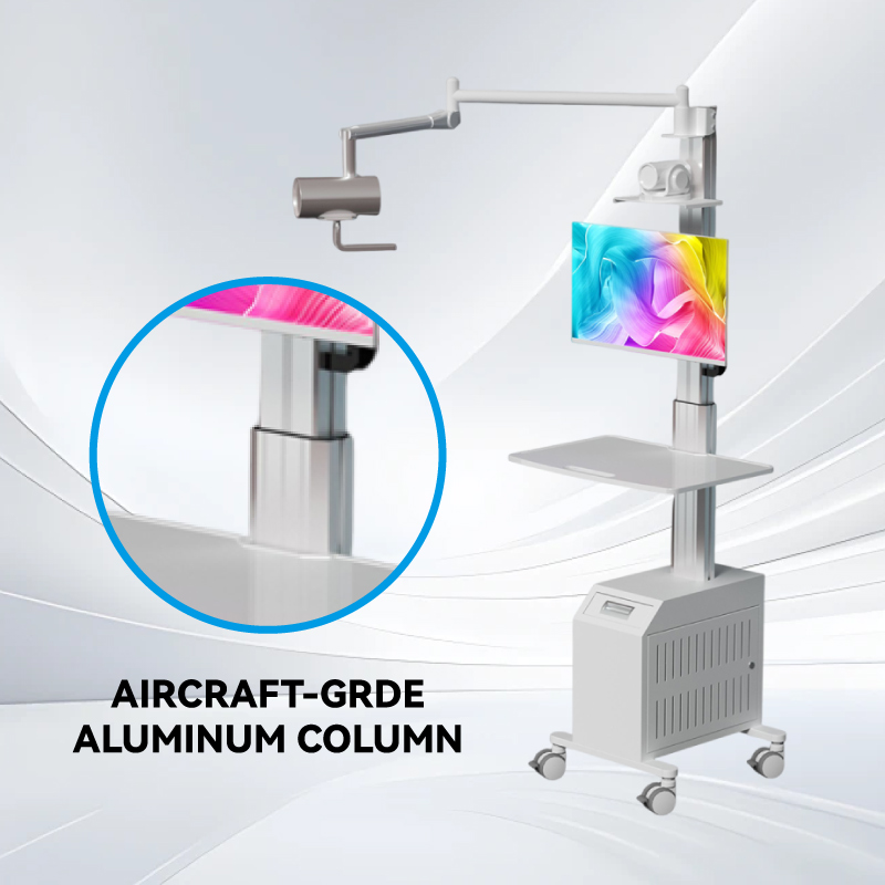 Медицинская тележка с регулируемой высотой и пневматическим рычагом, обеспечивающим свободное перемещение и вращение во всех направлениях, оснащена держателем внутриротового сканера.
