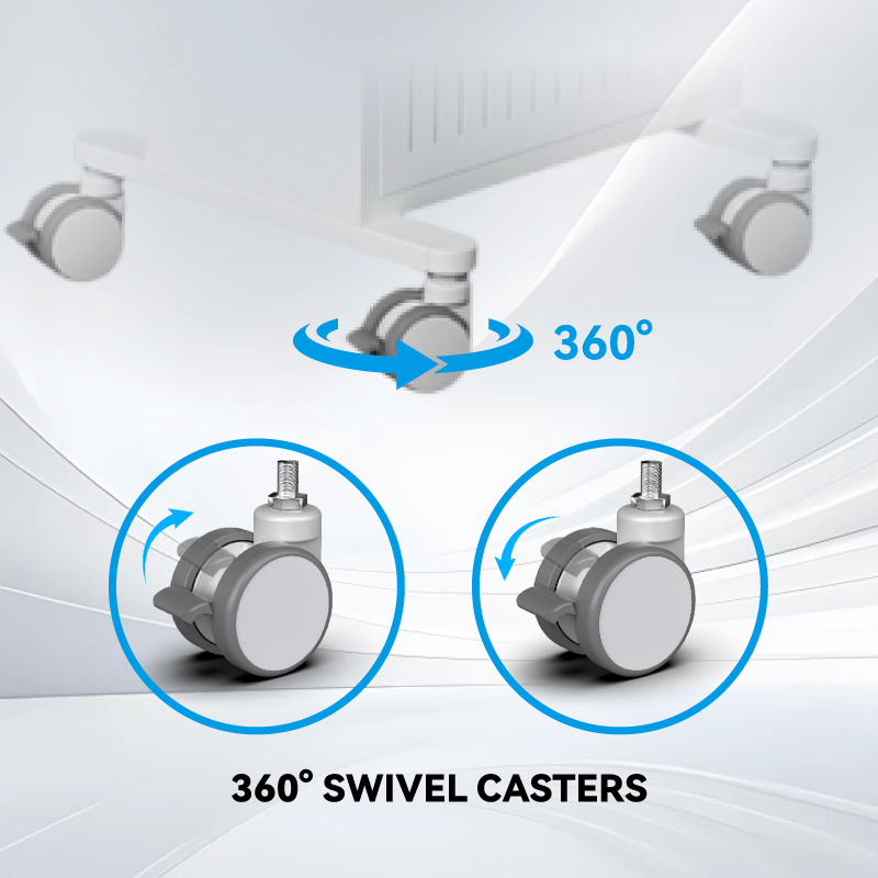 Тележка для ноутбука Likaymo оснащена четырьмя 3-дюймовыми (7,5 см) поворотными на 360° колесами с ножными тормозами для плавного перемещения и надежной фиксации. Большие колеса легко преодолевают пороги и неровности ковровых покрытий, обеспечивая легкую маневренность на различных типах полов в клиниках, больницах и салонах красоты. Благодаря прочной раме тележка остается устойчивой во время использования, а фиксаторы колес надежно фиксируют ее в неподвижном состоянии.