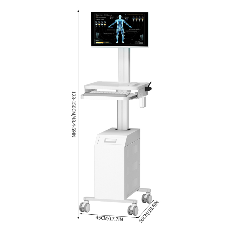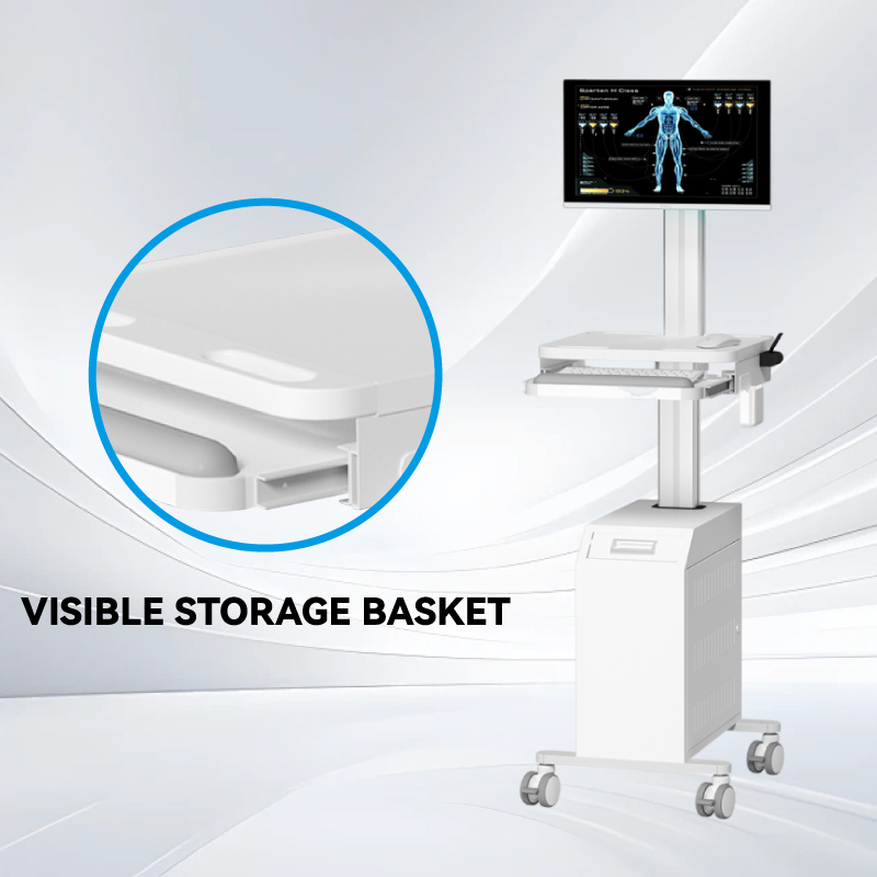 Эта пневматическая тележка для обхода палат имеет регулируемую высоту, встроенный дисплей и компьютер, а также шкаф для хранения в основании. Она легко перемещается по палатам, помогая медицинскому персоналу эффективно выполнять электронные обходы пациентов и сестринские работы.